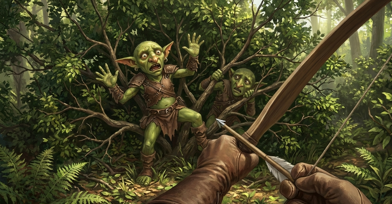 The next morning the party came across a small forest of orange trees, with multiple dinosaurs feeding on them as they walked through collecting oranges in their packs, Tuna noticed that nearby in a bush goblins are following them. The part continued forth while Sara stealthily climbed a tree and circled back around behind the goblins. She tried to scare and intimidate the four goblins unsuccessfully, until Tuna knocked one out with a dart from her new blowgun. The goblins dropped their weapons and said they need help - there’s a treasure that only non-goblin creatures can retrieve by completing a traditional goblin ritual. The goblins led them to their village where their matriarch Forb - a female goblin with an albino snake on her neck greeted them. Instantly, they felt under obligation to tell only the truth in her chambers - as affected by a zone of truth spell.