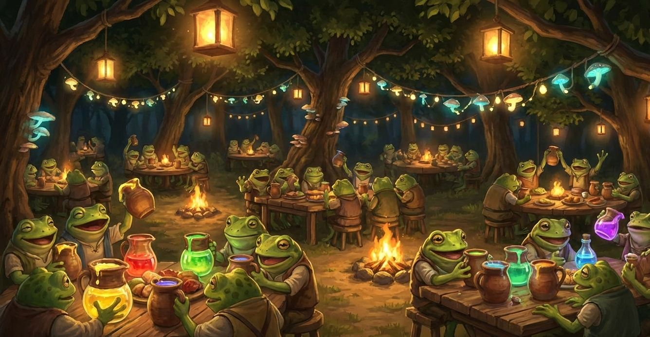 The king happy with the result started celebrations, grungs brought tables food plenty of small birds, insects and squirrels, also 6 kinds of colored drinks littered the tables. As the feast continued more and more grungs started to act strangely - eating until they can hardly breathe, loudly croaking or just rolling around in the mud. The king answered all the questions the party had, pointing out the location of Omu about 30 days of travel south east of here, commenting on the flying beasts that inhabit the firefinger and revealing that there is a maze portal beneath this chamber.