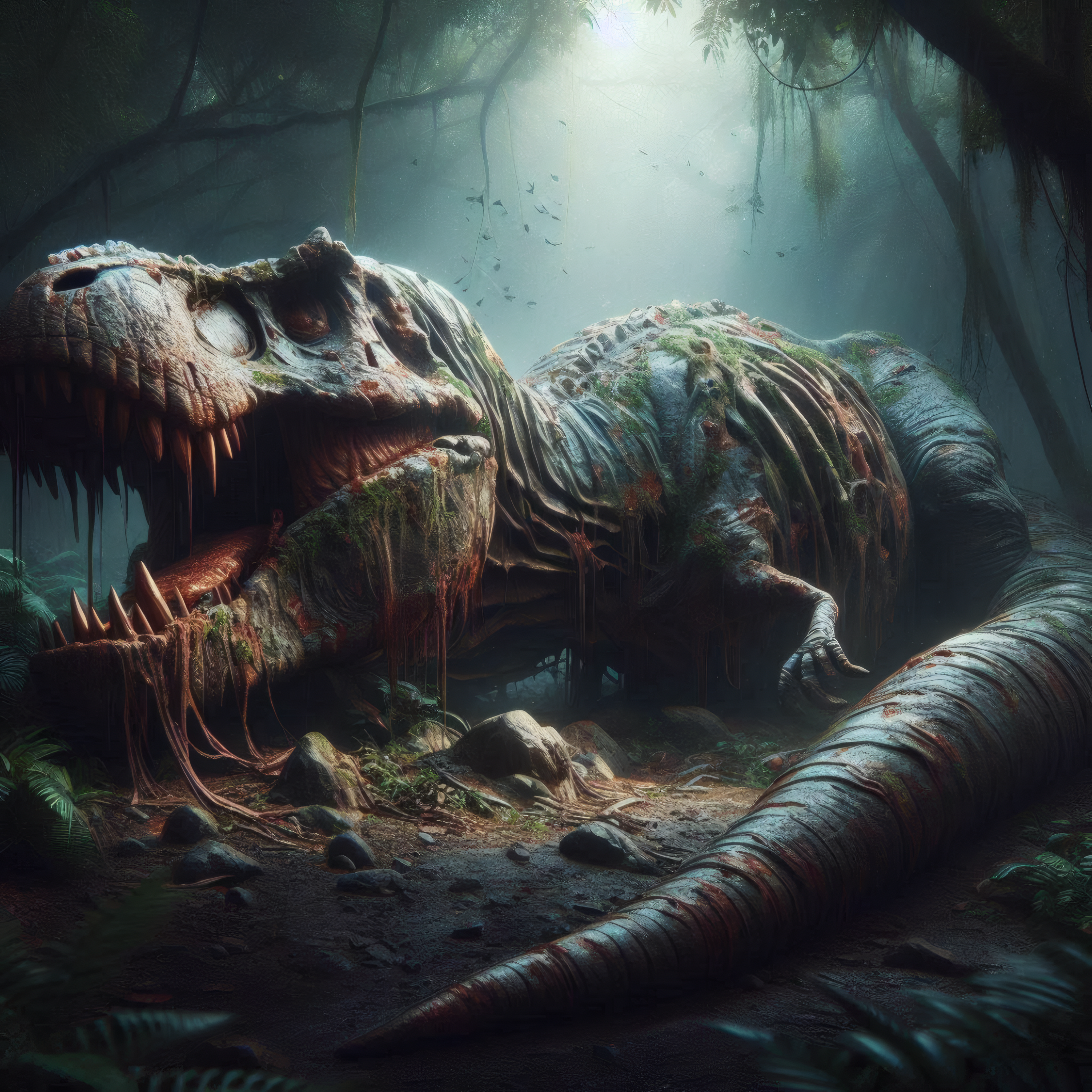 After a save long rest in the cave the party pushed further south, where they encountered a giant tyrannosaurus rex body, after careful investigation they realized it was Undead, as Sara tried to remove a shiny object from the zombie dinosaurs abdomen - he woke up and started trashing lookin around. She was able to remove the object and toss it to the side as the party is now thinking whether to run, hide or fight against the undead beast.